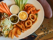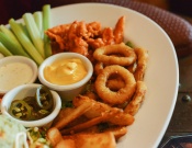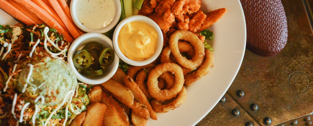 Deliciosos buffalo boneless, onion rings, chili beans nachos y crujientes fantastic fries, acompañado con aderezos, zanahoria y apio.