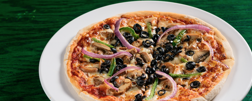 Pimiento verde, cebolla, champiñones, aceitunas negras, queso mozzarella y salsa marinara.