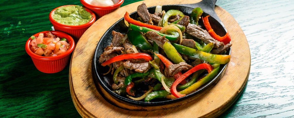 Jugosas fajitas sazonadas al estilo Comicx con pimientos verdes y rojos, cebolla asada, servidas en un sartén caliente acompañadas de salsa pico de gallo, guacamole y crema.